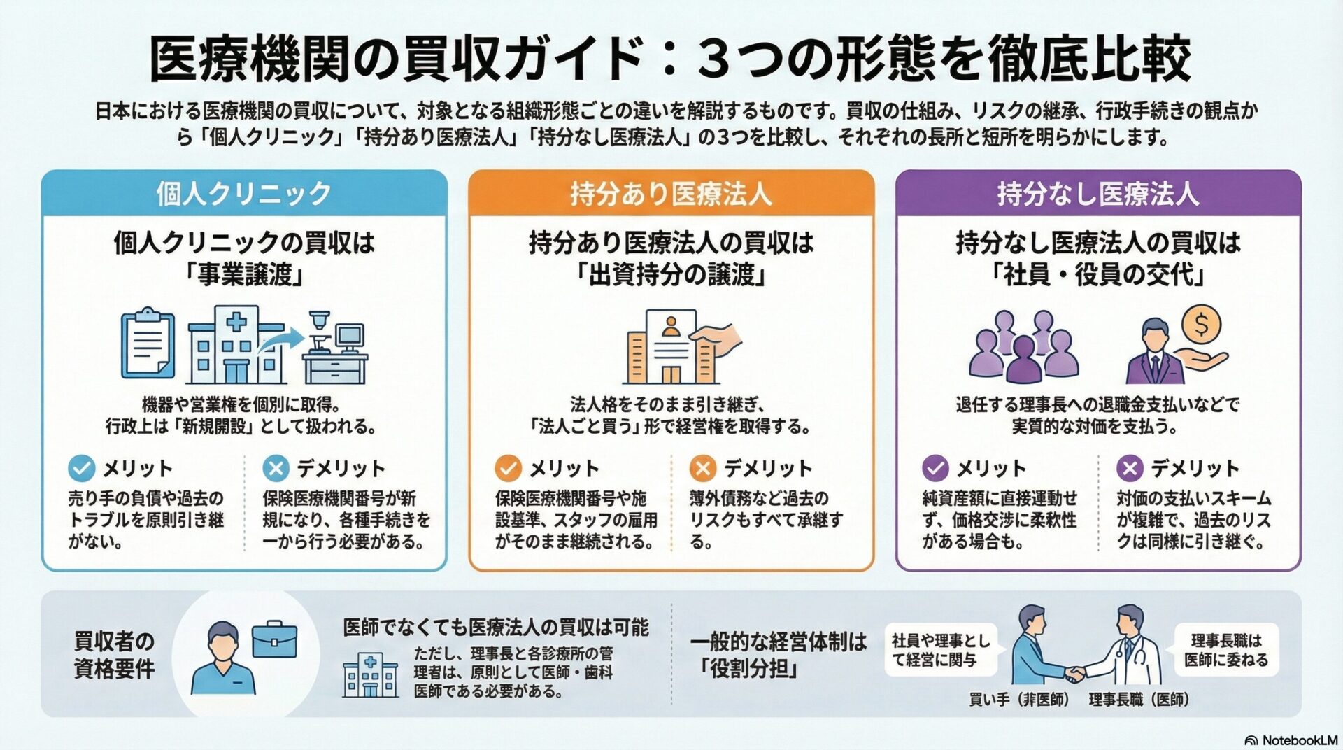 デメリット: 簿外債務や診療報酬の返還リスクなど、過去の問題も承継する。内部留保が大きい法人では買収価格が高額になりやすい。