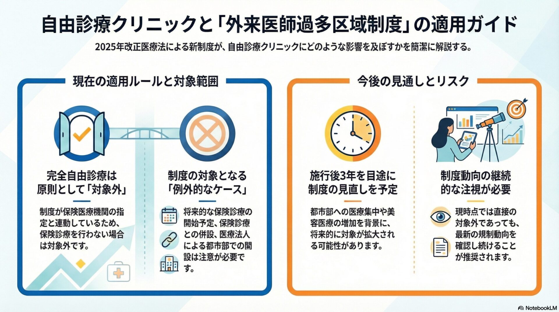 2025年12月成立の改正医療法により導入された「外来医師過多区域制度」について、自由診療クリニックへの影響を気にされるご相談が増えています。