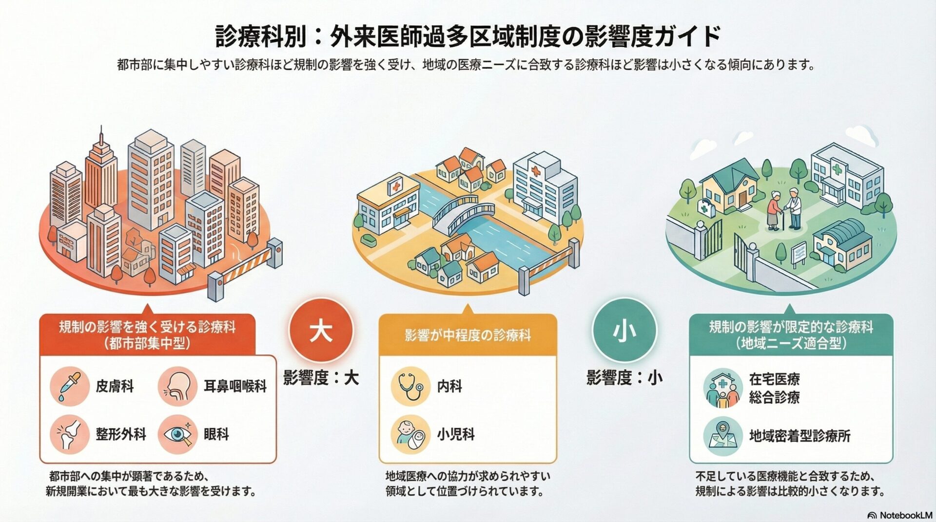 HOME > ニュース > 診療科別にみる影響ランキング(開業規制の影響が大きい診療科) 診療科別にみる影響ランキング(開業規制の影響が大きい診療科) 投稿日:2026年3月31日 外来医師過多区域制度は、診療科によって影響の大きさが異なります。 以下は実務上の影響度の目安です。 ■ 影響が大きい診療科 皮膚科 耳鼻咽喉科 整形外科 眼科 都市部集中が顕著なためです。 ■ 中程度の影響 内科 小児科 地域医療機能への協力が求められやすい領域です。 ■ 影響が比較的小さい 在宅医療中心診療所 総合診療 地域密着型診療所 不足医療機能と一致するためです。